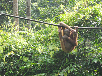 Kyllapa serkkupojat olivat hauskoja veikkoja. Me ja lukuisat muut turistit paasimme seuraamaan orankien ruokintaa Sepilokin suojelukeskuksessa. Matkasimme sinne paikallisbussilla, matkaa oli noin 25 kilometria. Keskus pelastaa orankien poikasia ja sopeuttaa ne takaisin luontoon. Naimme hauskan videopatkan, jossa vauvoja ruokittiin tuttipulloilla ja karrattiin kottikarryilla jumppatunnille harjoittelemaan kiipeilya.