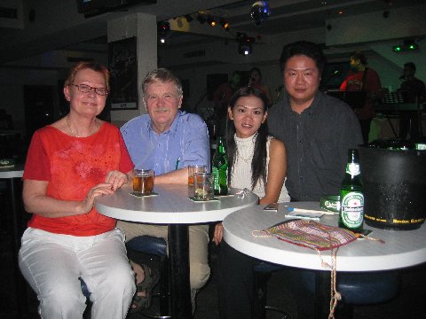 Ilta jatkui Dolphin yokerhossa, jossa seuraamme liittyi Kennyn viehattava tyttoystava. Ayan on kotoisin Borneolta. Hanen mielestaan siella ei ole mitaan nahtavaa. Kumpikaan ei edes tiennyt, mita isonenaiset apinat ovat… Kuuntelimme paikallista live-musiikkia oluen saestyksella (katso kuva). Luulimme jo selviavamme kunnialla illan haasteista, kun poytaan kannettiin kokonainen pullo Chivas Regalia. Elama on vaarallista taalla suuressa maailmassa!