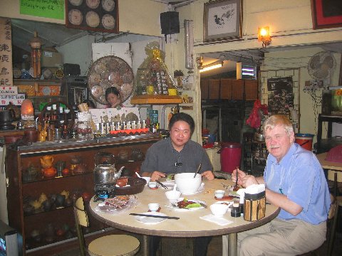 Huomenta taas. Oli pakko tulla kirjoittelemaan Kennylle kiitokset, eilinen ilta oli mahtava. Kenny vei meidat kaupungin ulkopuolelle traditionaaliseen kiinalaiseen ravintolaan, joka oli lahes laho vanha puutalo. Mutta ruoka oli ihanaa. Isantamme oli tilannut valmiiksi perinteisia ruokalajeja, joita oli useita. Aluksi saimme kasinpoimituista lehdista haudutettua teeta. Sita juotiin pienista kipoista, jotka taytettiin ainakin sata kertaa illallisen aikana. Alkuruuaksi tarjoiltiin ruskeita papuja ja friiterattua merilevaa. Seuraavaksi tuli kanakeitto ja paahdettua porsasta. Mina jatin tosi epakohteliaasti ne valiin.. Mutta paaruoka maistui. Ravintolan akvaariosta ongittu crouper -kala tuotiin soijakastikkeella valeltuna kokonaisena poytaan. Sen seuraksi saimme riisia ja wokattuja rapuja valkosipulin ja vihrean parsan kera. Mutta ei tama viela mitaan, lopuksi seurasi yllatysjalkiruoka. Sokeriliemessa kellui kaksi pyoreata munannakoista taikinapalloa. Sisalla oli vihreaa pinaattia ja inkivaaria. Selvisimme kunnialla, vaikka vahan epailyttikin. Kehotimme Kennya maistelemaan ensi viikolla mammia, silla han on tulossa tyoasioissa viikoksi Suomeen.