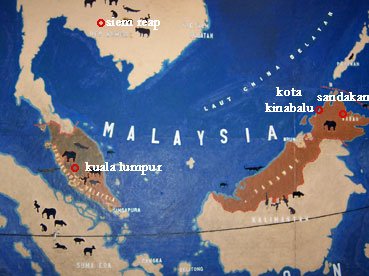 matkareittimme kulki Kuala Lumpurista Kambodzhaan Ankor Watiin – sieltä KL:n kautta Borneolle Sabahin pääkaupunkiin Kota Kinabaluun – edelleen Kinabalu-vuoriston kautta Sandakaniin (nenäapinoita ja orankeja) – sieltä Johor Bahruun ja Singaporeen – lopuksi aurinkolomalle Tiomanin saarelle ennen paluuta lähtöpisteeseen Kuala Lumpuriin
