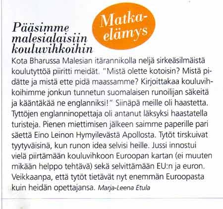ET-lehti pyysi viime vuoden puolella yleisökirjoituksia ikimuistoisista matkakokemuksista. Lähetin pari juttua ja unohdin asian saman tien. Eilen kotimatkalla selailin toukokuun numeroa. Jouduin katsomaan kaksi kertaa matkasivua, jossa uuden Malesia-opaskirjan esittelyn lisäksi komeili matkaelämys, jossa oli minun nimeni. Olihan se uskottava, että tarina oli oma ja julkaistu lehdessä.