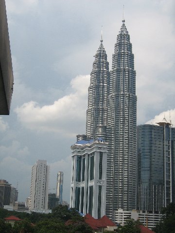 Sawasdee, perilla ollaan! ”Nyt alkaa kesa-aika”, Jussi sanoi, kun vaihtoi pitkat kalsarilla lyhyisiin lentomatkan jalkeen. Vahan kylla huimasi, kun Amsterdamista lahdettaessa KLM:n info kertoi, etta matkaa on yli 10000 kilometria ja lentoaika 11 tuntia. Selvisimme siita kuitenkin paremmin kuin hyvin. Ruokaa oli riittavasti (ei kummoistakaan) ja viinitarjoilu pelasi. Penkit oli muotoiltu nukkumisystavallisesti, silla herasimme vasta puolitoista tuntia ennen perilletuloa. Niinpa siirryimme virkeina KLIA expressilla (= lentokenttapikajuna) keskikaupungille ja taksilla hotellille. Asumme 11. kerroksessa ja naemme ikkunasta twintowerisin huiput. Valaistuina ne ovat tosi komeat.