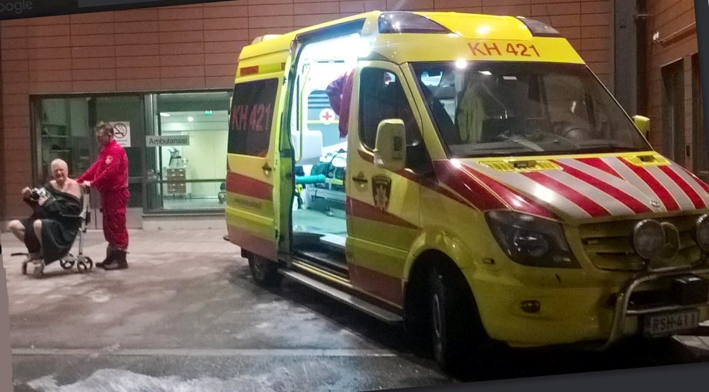 Istahdin television ääreen ja ihmettelin parinkymmenen minuutin kuluttua, miksi mies ei tule pois. Pelästyin oikein todella, sillä Jussi oli lyyhistynyt alalauteelle löylykiulun päälle. Hän oli tajuton enkä onnistunut nostamaan häntä parempaan asentoon. Soitin välittömästi 112 hätäkeskukseen ja pelastuspartio tuli viidessä minuutissa. Kaksi riskiä nuorta miestä sai tehdä töitä, ennen kuin Jussi saatiin pois saunasta. Hän oli saanut lämpöhalvauksen ja palovammoja. Ärhäkän punainen ämpärin kuva oli rinnan ympärillä, toinen sääressä. Viilensimme häntä tehokkaasti tuuletuksella ja kylmillä märillä pyyhkeillä. Sitten kylpytakki päälle, mies pyörätuoliin ja kiidimme ambulanssilla keskussairaalan ensiapuun.