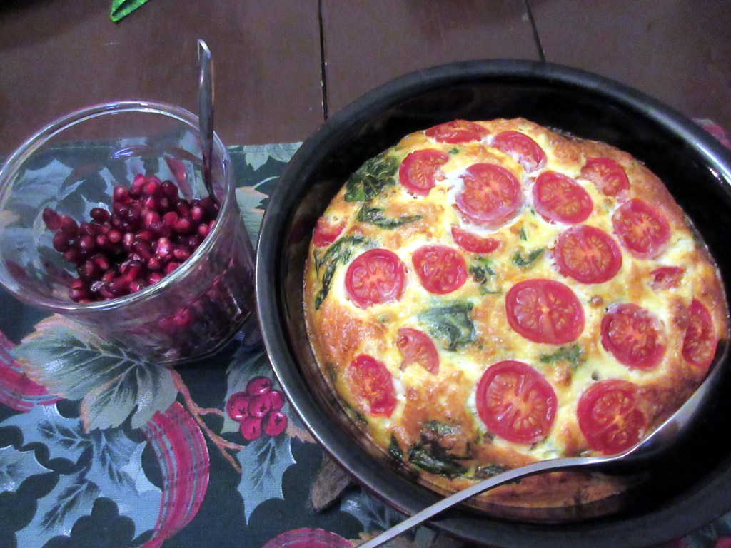 Saimme perunasalaattia pekonin kera, granaattiomenoita sekä mehevän feta-pinaattimunakkaan. Joulukuusipartio kiittää.