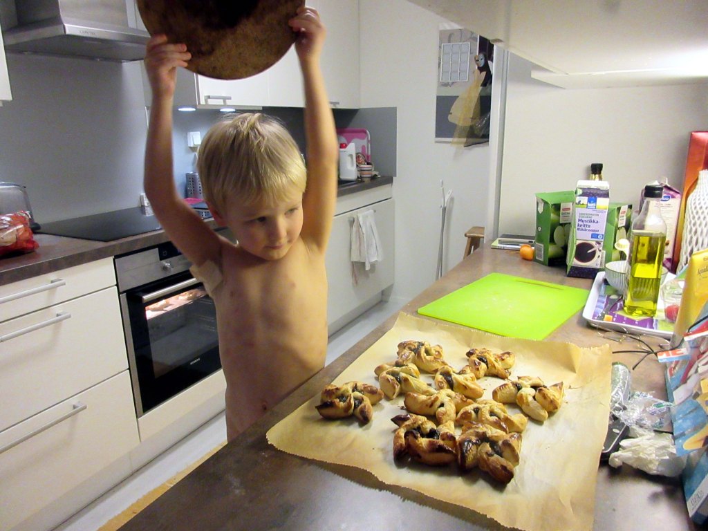 Jälkiruokakahvin kanssa tarjoamme Samun ja minun eilen paistamia tähtitorttuja. Parvekkeella on hyytymässä Annan tekemä luumurahkakakku. Rapsimme kilvan kulhoa, sillä makuyhdistelmä oli herkullinen. Niin ja pipareitakin on vielä, vaikka herkkusuut ovatkin nakertaneet niitä jo ahkerasti.