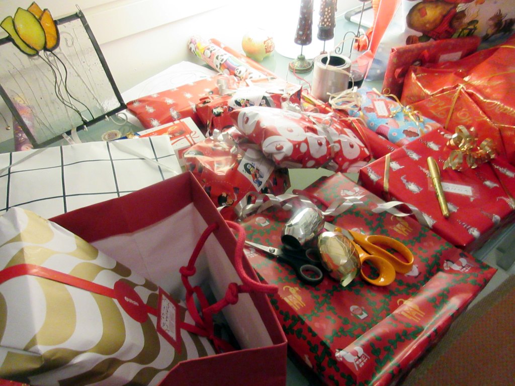 Mummin lahjapakkaamossa oli eilen illalla tohinaa. Pikkupojat ovat olleet kilttejä. Joulupukki oli jättänyt pinon lahjoja paketoitaviksi.
