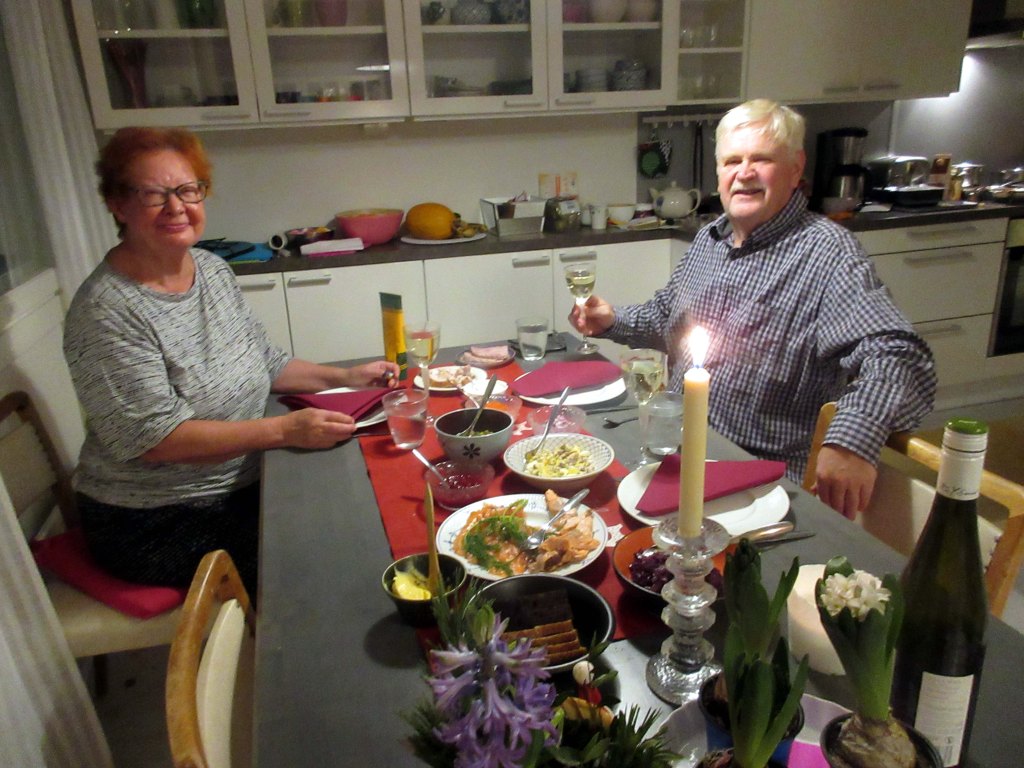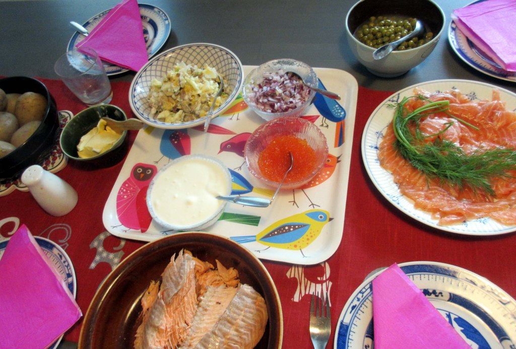 Omatekoiset peruna- ja porkkanalaatikot hautuvat uunissa. Suomen Turku julistaa kohta joulurauhan. Jouluvalmistelut ovat hyvällä mallilla. Jussi paistoi illalla ison kalkkunan uunissa. Katamme jo päivällä kalapöydän. Siihen tulee Jussin savustamaa lohta ja graavikalaa, mätiä, sipulia, smetanaa sekä kuoriperunoita.