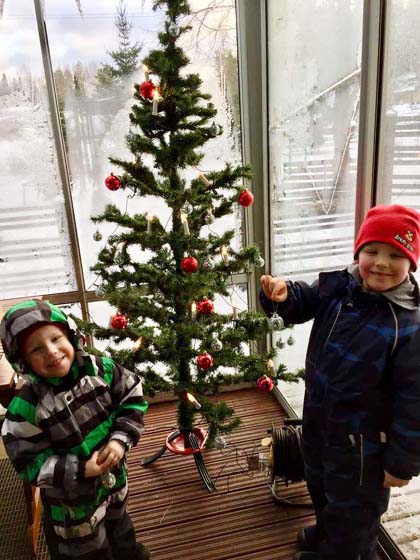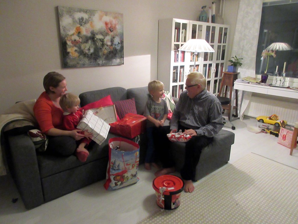Saunan ja ulkoilun jälkeen tunnelma tiivistyi. Joulupukki oli jättänyt suuren lahjakassin, joka kiinnosti poikia kovasti.