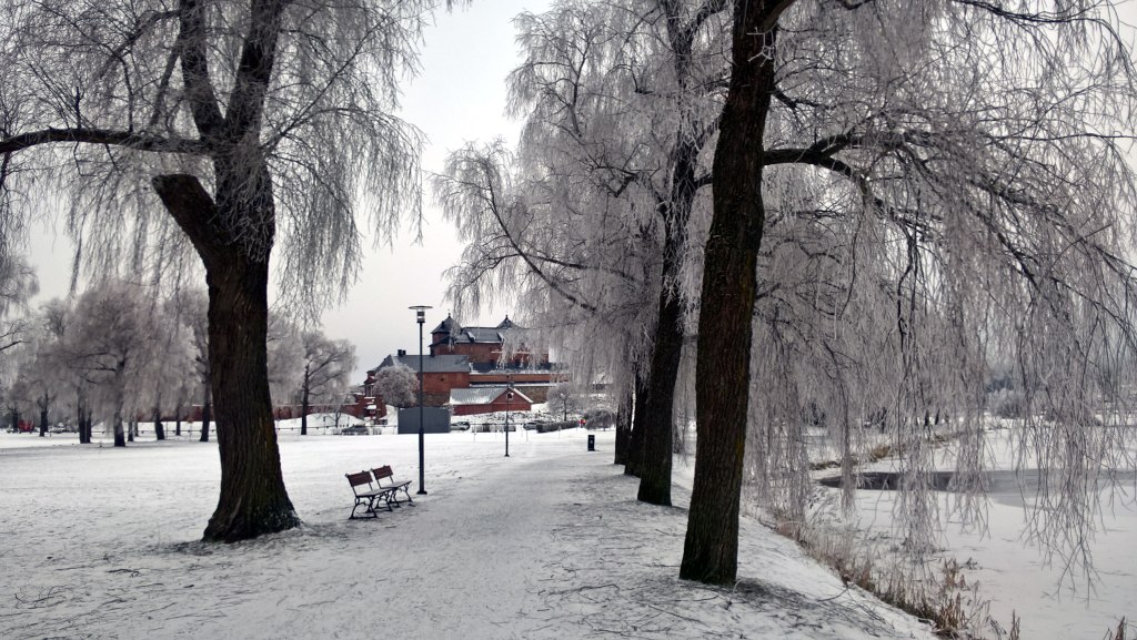 Tammikuinen maisema oli kuin sadusta. Kävelimme linnanpuistossa ja ihastelimme valkoisiksi huurtuneita puita.