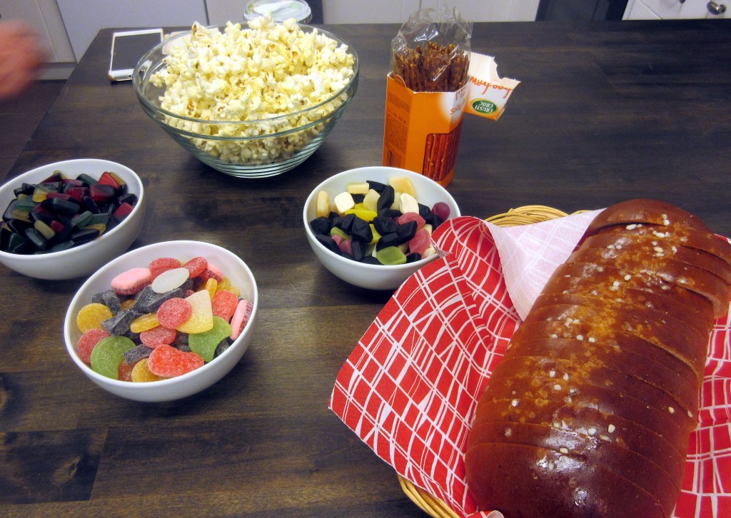 Meitä marttoja oli paikalla salin täydeltä. Tarjoilu oli elokuvailtaan sopiva: kahvia, tuoretta pullaa, popcornia, karkkia ja sipsejä. Otamme jatkossa taas emäntäryhmät käyttöön. Se tarkoittaa omatekoisia suolaisia ja makeita herkkuja.