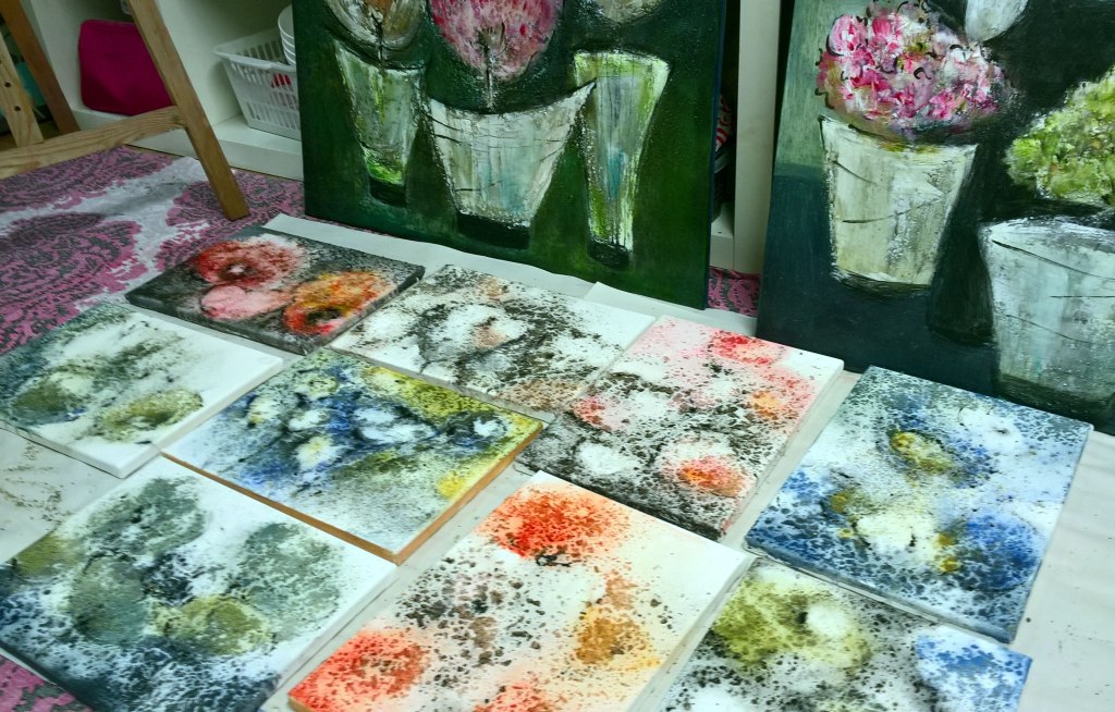 Tuomelan Marttojen kevätkausi alkaa tänään. Meillä on tiedossa elokuvailta. Minkä elokuvan näemme, sitä en vielä tiedä. Vietin aamupäivän työhuoneella viimeistelemässä Jorvin näyttelytauluja. Niitä on nyt tarpeeksi. Maalasin reunoja ja lisäsin hyvin hyvin varovasti muutamiin kukkiin kultahippuja. Lyöntimetalli on henkäyksen ohutta. Kullankimallus näyttää ylelliseltä, mutta sitä ei saa olla liikaa. Seuraavaksi on vuorossa silmukkaruuvien ja ripustuslankojen kiinnitys. Sitten vielä signeeraukset ja vaikein tehtävä – nimien keksiminen. Olen siinä lajissa kovasti huono. Taiteilijakollegat osaavat antaa runollisia nimiä, minä en.
