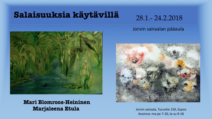Jorvin sairaalan etusivulta löytyy nyt pieni TAPAHTUMIA -ilmoitus, jossa näyttelymme on julkistettu. Avajaisia ei ole tulossa, mutta meidät tapaa ainakin ripustus- ja purkupäivinä.