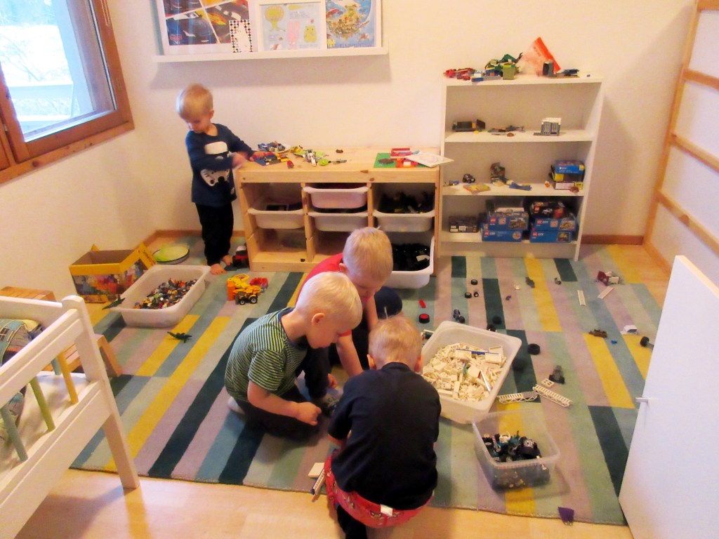 Poikasilla riitti touhua koko lauantai ja sunnuntai sisä- ja ulkoleikeissä. Anna piti yllä järjestystä ja minä kokkasin uunilohta ja perunoita ja lettuja ja puuroa. Kaikki maittoi.