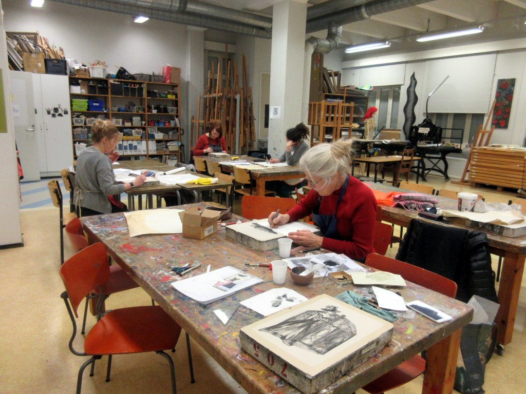 Palasin sunnuntaina jo päivällä Hämeenlinnaan, sillä meillä paperihuonelaisilla oli kevään ensimmäinen litografiatapaaminen. Uusia jäseniä oli paikalla kaksi. Paula ja minä opastimme alkuun. Se tarkoitti painavien litokivien hiomista. Sen jälkeen kaikki syventyivät piirtämään kuvia kalkkikiville. Viikon kuluttua jatkamme. Silloin on vuorossa kuvien etsaus typpihapolla sekä vedostus. Se on vaiheista jännittävin ja yllätyksellisin. Varsinkin jos kuvien piirtämisessä käyttää rasvaliitujen ohella tussia.