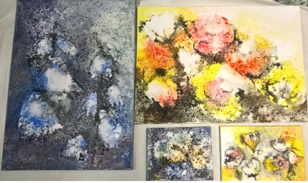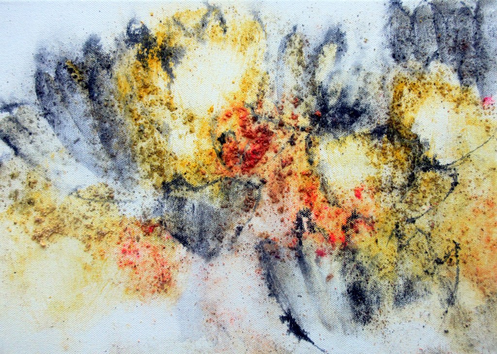 Viikko on alkanut lupaavasti työhuoneella. Huomasin, että minun kukkasarjastani puuttuu tyystin keltainen keto. Se oli pian korjattu, sillä pieniä 24 x 33 cm pohjia oli vielä sopivasti kolme jäljellä. Keltakukat syntyivät eilen tarmonpuuskassa.