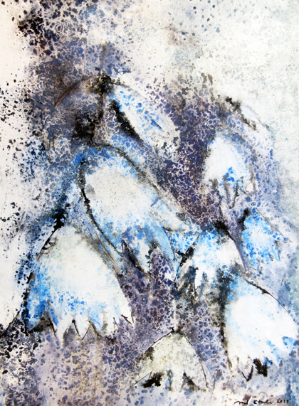 Kaupunki oli tänään lumenvalkoinen, kun taivaalta tuprutti hiutaleita. Minä viihdyin tänäänkin työhuoneella. Mitä lähempänä näyttelyn ripustus on, minä tulen sitä tarmokkaammaksi.