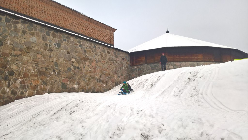 Päivä oli kylmä ja luminen. Anna puki aamupuuron jälkeen poikaset toppahaalareihin. Ulkoilimme linnan sisäpihalla, jossa oli kunnon pulkkamäki.