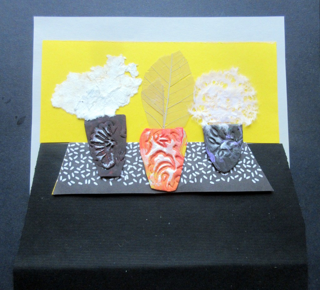 Tavoitteena on antaa töille oma kädenjälki. Siis ei valmiita lehdistä leikattuja kuvia, vaan itse kuvioituja papereita ja omia piirroksia uusissa ympäristöissä.