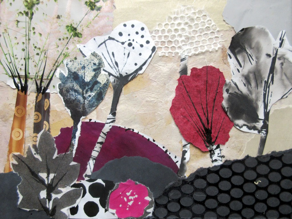Vaikka piirustuskurssimme ei kestä kuin helmikuun loppupuolelle, ehdin tehdä uuden näköisiä koosteita isommankin sarjan. Ajattelin teemaksi ”villi viidakko”, mutta ainakin ensimmäiset työt ovat aika kesyjä tyyliteltyjä kukkia.