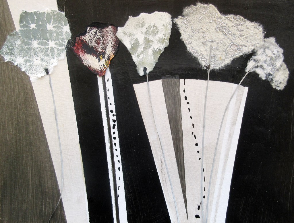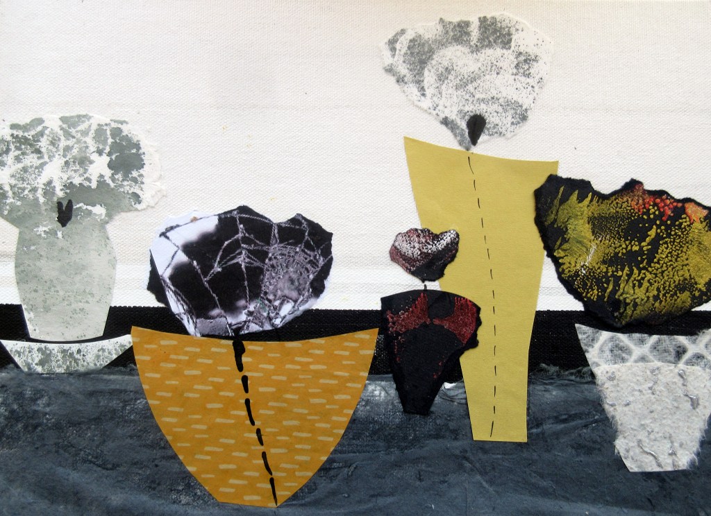 Opiskelutehtävähaaste jatkuu. Olen edelleen innoissani. Suunnittelin tekeväni kollaasimenetelmällä villin viidakon. Mitä vielä, olen tehnyt vain kesyjä kukkia.