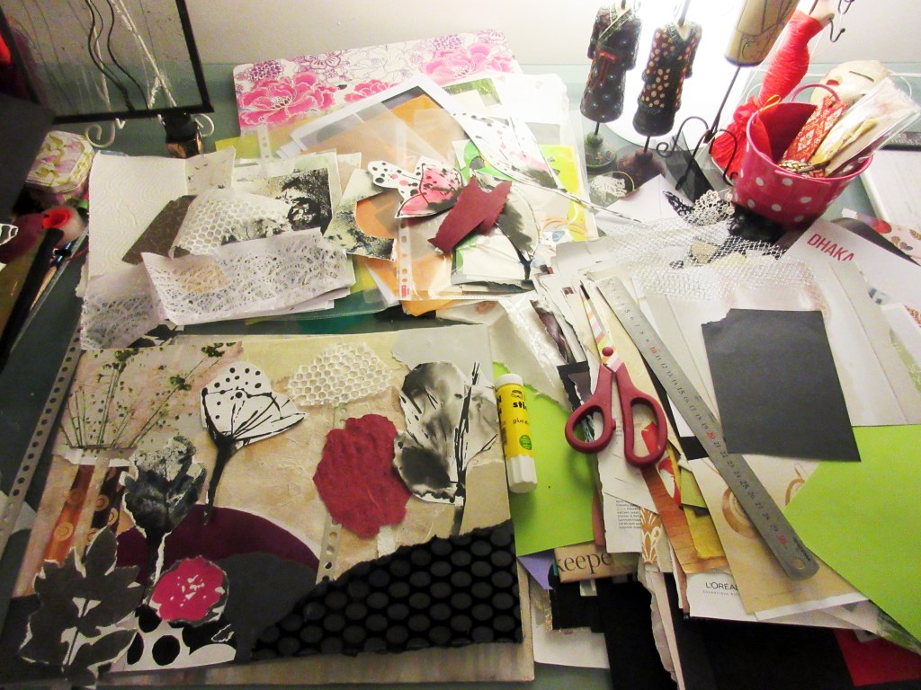 Sain tarmonpuuskan ja siivosin työhuoneeni perusteellisesti. Se oli tarpeen. Kannoin kotiin monta kassillista kollaasimateriaalia. Niistä syntyy villi viidakko ja muuta mukavaa. En olisi uskonut, että aineopintojen piirustusjakso voi olla näin innostava. Opettajan taikasana tehtävänannossa oli piirrossarja ”omista lähtökohdista”. Olen aivan täpinässä kollaasi-ilosta.