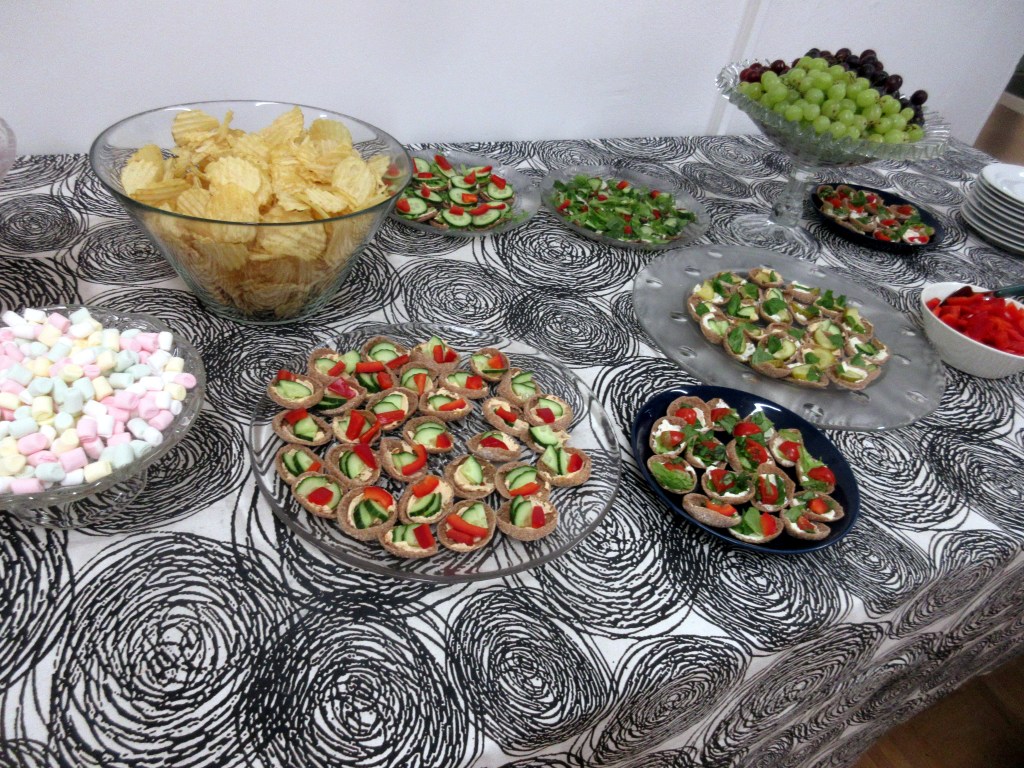 Avajaiset ovat mukavia. Laitoimme kimpassa tarjolle ruisnappeja, jotka täytimme tuorejuustolla ja koristelimme kurkulla, paprikalla ja basilikalla.