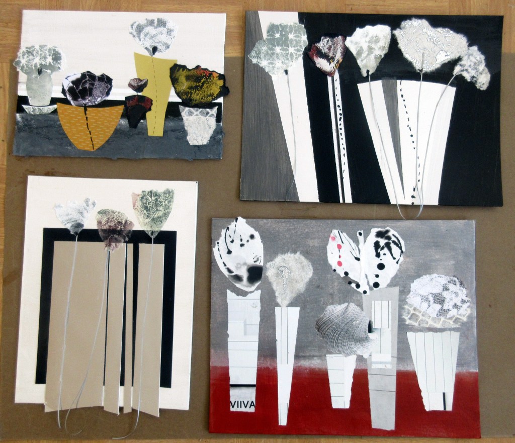 Kukkakollaasisarjani on jatkunut kiivaana. Päätin jo eilen toppuutella. En voi mennä kurssille kymmenen valmiin työn kanssa. Mutta voin ehkä mennä viiden valmiin työn kanssa. On ylellistä saada kommentteja, mihin suuntaan kannattaa jatkaa. Olen vastaanottavainen kritiikille, sillä siihen tottui taidekouluaikana. Toisten töissä näki puutteita, vaan ei omissaan, ennen kuin opettaja arvioi värien käyttöä ja sommittelua. Sitten näki.