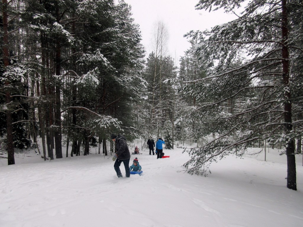 Suunnistimme alkuvirkistyksen jälkeen pienessä lumipyryssä pulkkamäkeen. Anna ja pojat eivät päässeet tänä vuonna mukaan, sillä Samu oli kipeänä.