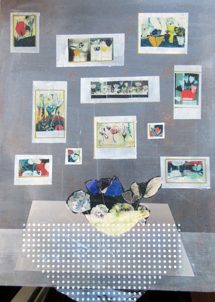 Maalasin pohjan akryyliväreillä (hopeaa, pigmenttejä ja askartelukaupan suosituksesta myös silkkivärejä). Kukkapöytä on offset-peltiä, kuinkas muuten, sitähän meillä grafiikanpajalla riittää. Taulujen kehykset syntyivät maalarinteipin avulla. Liimasin printtikollaasit decoupe-lakalla. Viimeistelin kultatussilla. Suurin osa kollaaseissa käyttämistäni materiaaleista ovat löytyneet työhuoneelta. Toki olen ostanut lisää akryylivärejä – viimeksi siis hopeaa – ja heräteostoksia teen aina kun jotain mielenkiintoista ilmaantuu. Lohdutan itseäni, että en käy vaate- enkä karkkikaupoissa. Pitäähän ihmisellä olla jotain intohimoja. Jos ne kohdistuvat taidetarvike- ja askartelukauppoihin, eihän se ole paha. Eihän.