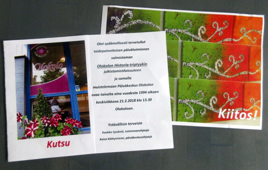 Eilen oli vauhdikas päivä. Sain ilokseni kutsun Hoiviaan taidenäyttelyyn. Samalla siellä vietettiin Olokolon päivätoiminnan päättäjäisiä. Ohjaajat Vuokko ja Kaisa olivat järjestäneet nostalgisen ohjelman. Näimme kuvia toiminnan historiasta vuodesta 1994 alkaen. Paikalla oli monta ohjaajaa, jotka tunnistivat henkilöt valokuvista ja muistelivat alkuaikoja.