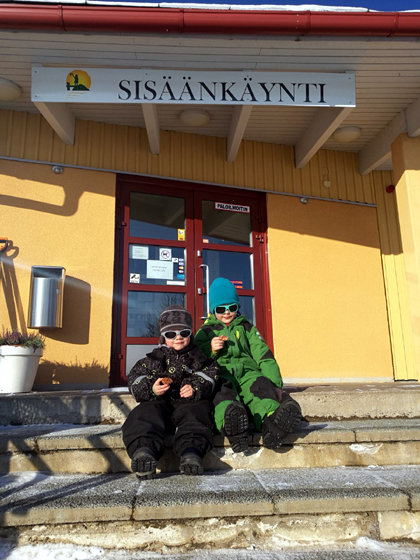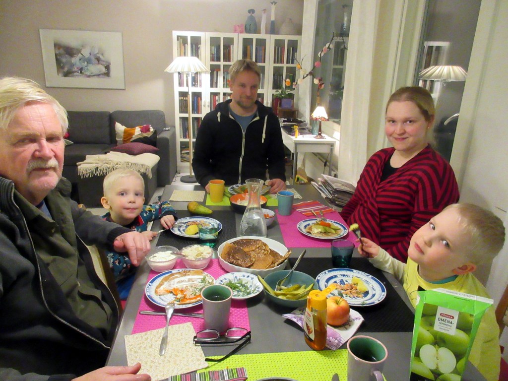 Hiihtolomalaiset Laura, Miika, Otso ja Visa tulivat eilen illalla. Minulla oli blinipannu kuumana. Letut maistuivat pitkän ajomatkan jälkeen.