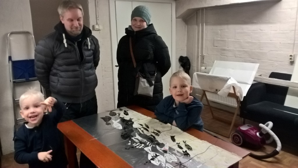 Tilaisuus huipentui seinille ripustettujen grafiikan vedosten esittelyyn. Idea oli vapaaehtoistyöntekijä Raijan. Hän houkutteli minut apuohjaajaksi ja vedostajaksi. Päivätoiminnan asiakkaat kuvittivat carborundum-tekniikalla Jenni Haukion runon ”Nocturne”. Jenni lähetti käsinkirjoitetun kiitoskortin, josta olimme kaikki ylpeitä.
