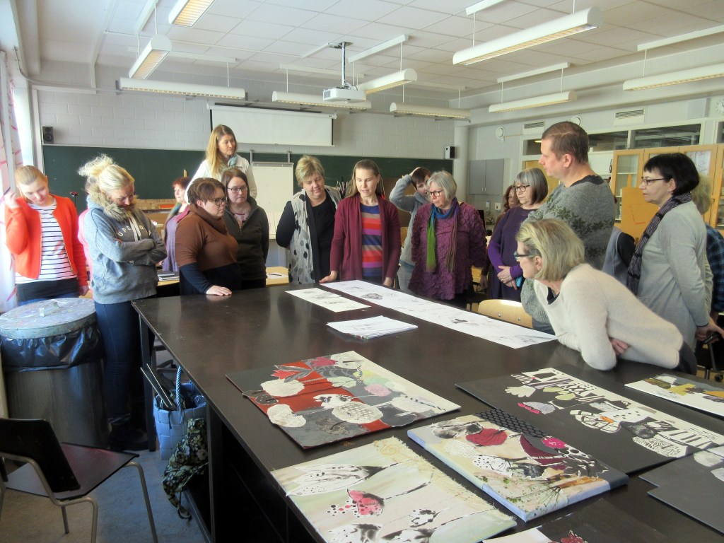 Jokainen sai vuorollaan laittaa kurssityöt näytteille ja kertoa niiden tarinan. Toisilla oli syvällisiä pohdintoja elämästä, toisilla (kuten minulla) pelkkää ilottelua aiheen parissa. Töiden kirjo oli suuri ja tekijöiden näköisiä. Tehtävänanto kuuluikin: ”Tee piirustussarja millä tekniikalla vain omista lähtökohdista”.