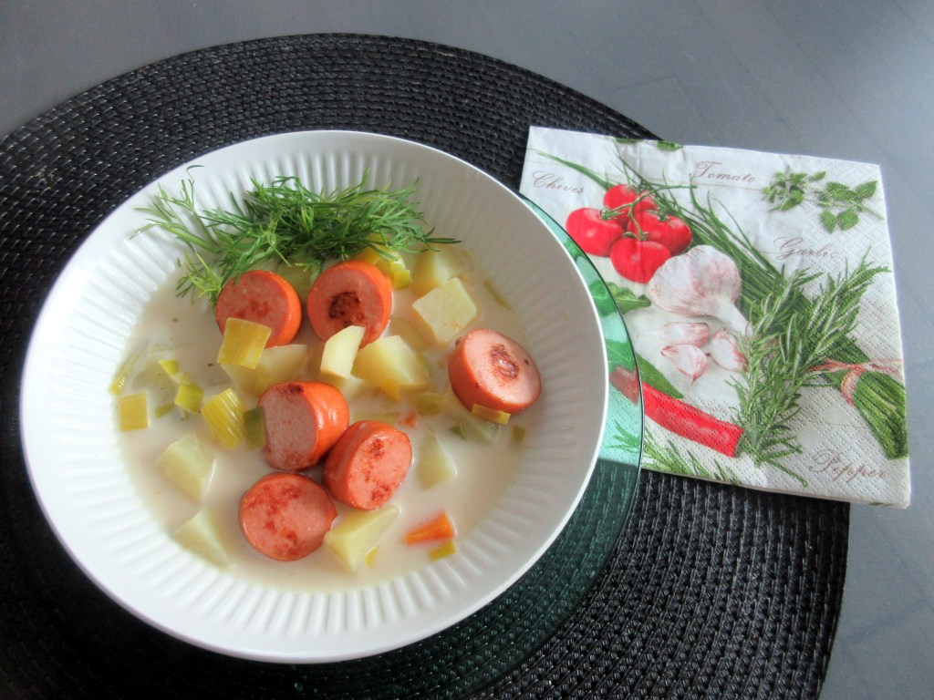 Olemme löytäneet Kivikylän kalkkunamakkarat. Niissä on makua moninverroin kevytnakkeihin verrattuna. Kokkasin niistä perinteisen makkarakeiton. Käytin liemenä kasvisfondia. Kuutioin ja kiehautin muutaman perunan, runsaasti sipulia ja purjoa sekä väriksi pari porkkanaa. Sain lisää makua hienoksi pilkotusta valkosipulista ja tuoreesta inkivääristä. Maustoin yrttisuolalla ja rouhitulla mustapippurilla sekä tilkalla kuohukermaa. Talvella pakkaspäivinä (tänään – 18 astetta) kuuma keitto lämmitti mukavasti.