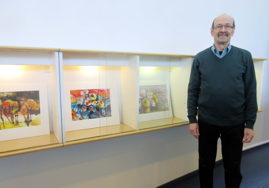 Pakkasta oli reilut kaksikymmentä astetta, kun starttasimme Hämeenlinnasta kohti Nummelaa. Valitsin Jorvin sairaalan näyttelytöistä parhaat ja pakkasin ne autoon. Lisäksi kyytiin pääsi tasan 35 akvarellia, joille oli paikat kirjaston lasivitriineissä.