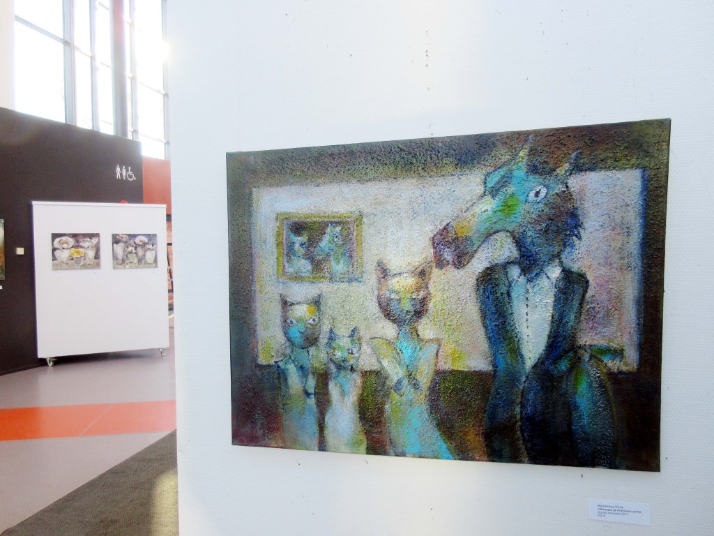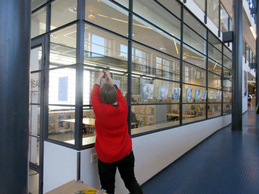 Niiden ripustus oli todella helppo. Perheystävämme Kaizu sijoitti maalaukset (pienellä opastuksella) vitriineihin. Minä kävin laittamassa niihin nimilaput ja sen jälkeen lasikaapit lukittiin. Siinä se.