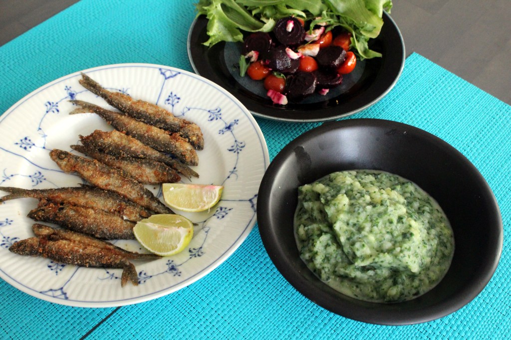 Jussi löysi lähikaupasta lähiseudun muikkuja. Hän paistoi ne rapeiksi. Minä tein kaveriksi pinaattiperunamuhennosta. Saimme taas väri-iloa ja makuiloa.