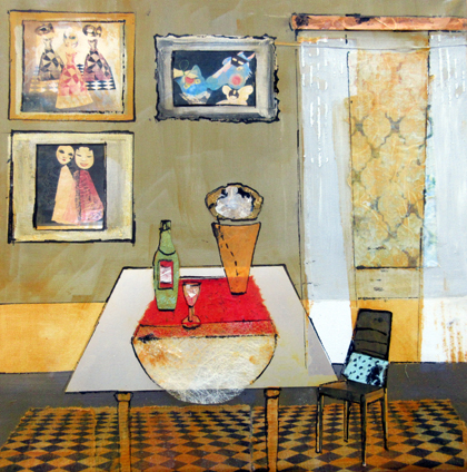 Minulle tuli kollaasiähky kuvataiteen aineopintojen piirustuskurssin myötä. Olen nyt pitänyt taukoa. Paitsi yksi kokeilu oli ihan pakko tehdä. Yhdistelin entistä enemmän maalattua pintaa pieniin kollaasielementteihin.