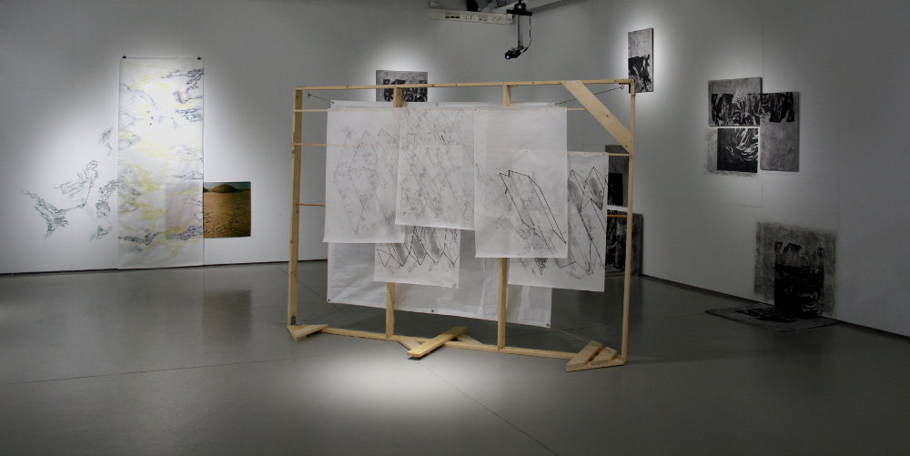 Galleria Koneen maaliskuun näyttely oli filosofinen. ”Outi Koivisto ja Milla Toukkari ehdottavat uutta tapaa nähdä painettu kuva. He käsittelevät taidegrafiikkaa rajapintojen, siirtymien ja käännösten kenttänä, jossa kuvan alkuperä kyseenalaistetaan yhä uudelleen. Se on heille ilmestyvien ja katoavien merkitysten sisällin.”