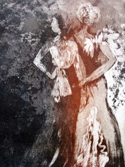 Minulla on muutama vakioaihe, joihin aina palaan. Olen piirtänyt ja syövyttänyt kuparille neitosen jos toisenkin. Nyt Vanajaveden opiston viikonloppukurssilla kokeilin ensimmäistä kertaa piirtää tytöt pehmeäpohjalle. Se tarkoittaa, että kuparille telataan joustava pohja. Sen annetaan kovettua yön yli. Sen jälkeen luonnoksen voi piirtää lyijykynällä huokoisen paperin läpi laatalle. Viiva syövytetään hapossa. Työstämistä voi jatkaa akvatintalla. Tähän asti olen hyödyntänyt pehmeäpohjaa vain struktuurin aikaansaamiseksi. Lukuisia pitsinpaloja on painunut kupariin.