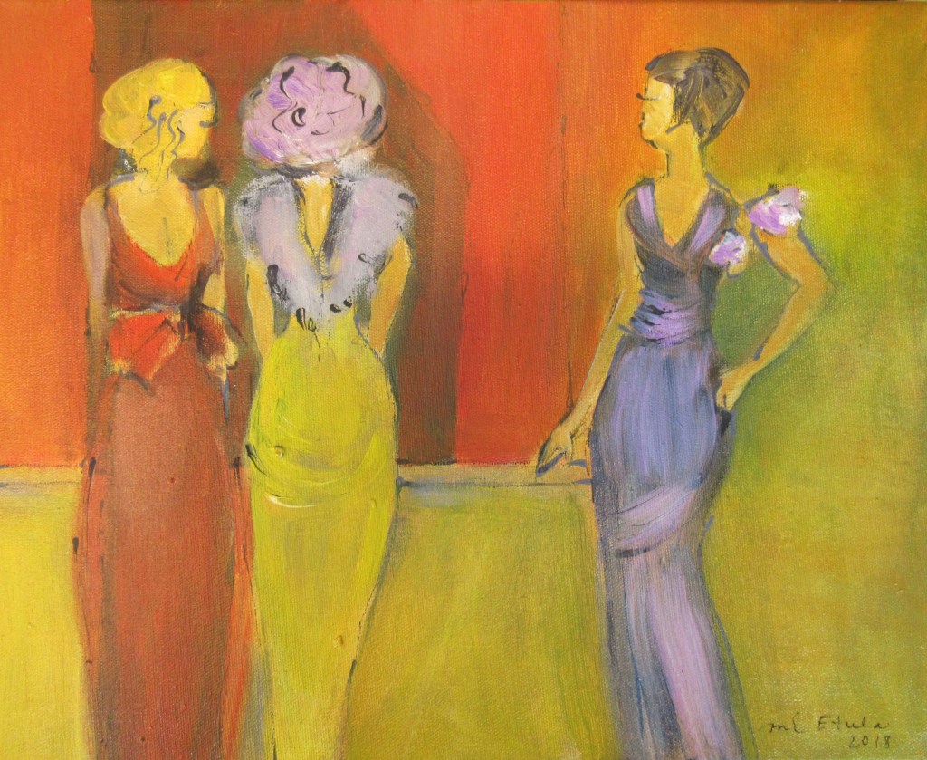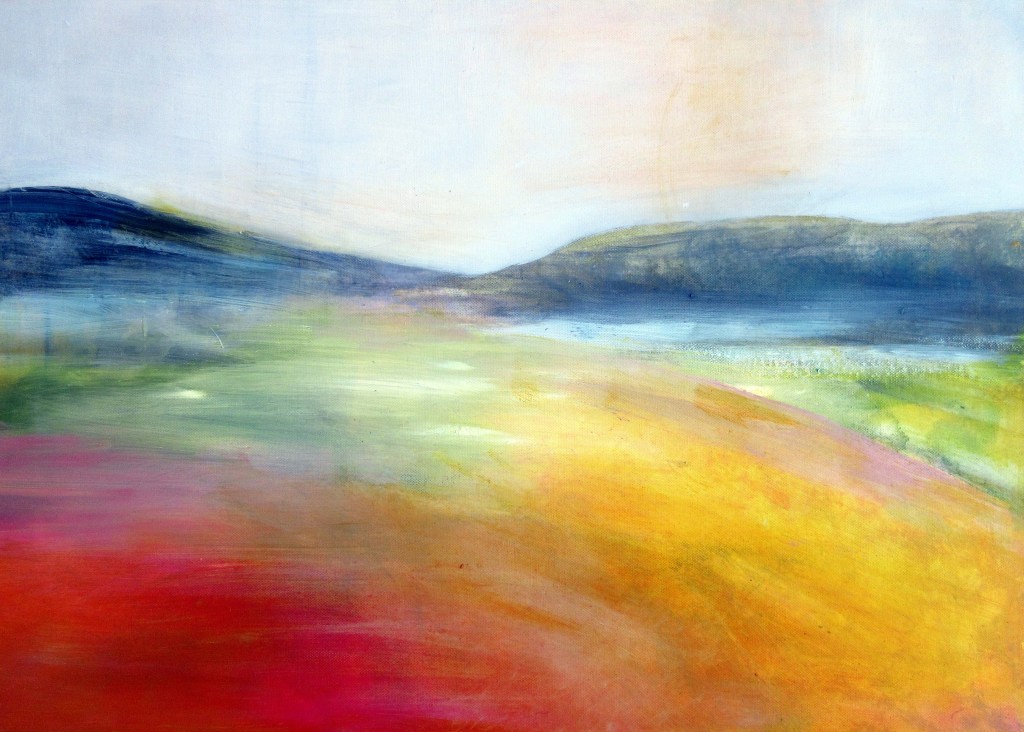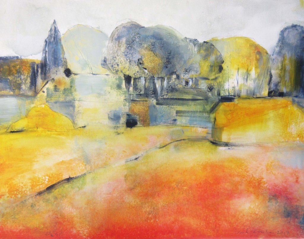 Jätin neljä värikästä maalausta huhti-toukokuun kevätnäyttelyyn opistolle. Aloitin akryyliväreillä ja viimeistelin maalaukset öljyväreillä. On hauska mennä lomamatkamme jälkeen katsomaan ripustusta.