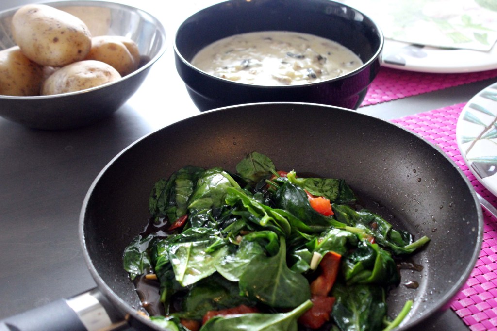 Kokkasin meille värikästä kotiruokaa. K-Marketista löytyi tuoretta pinaattia. Pakastimesta löytyi viime kesän kantarelleja ja tatteja. Molemmat maistuivat perunoiden kera.