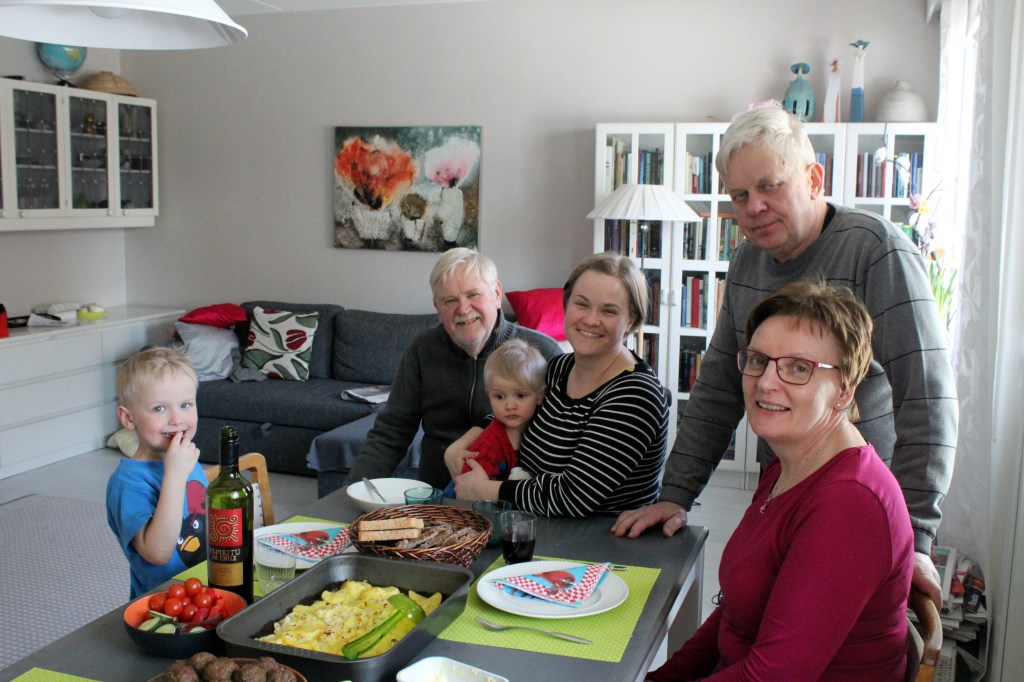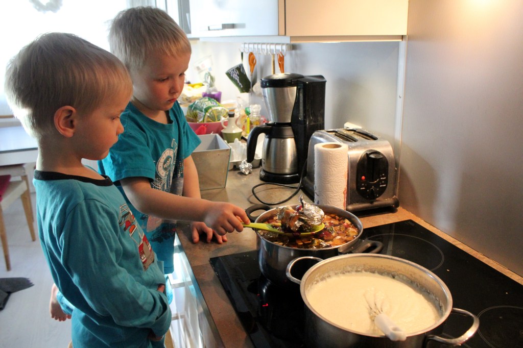 Anna, Samu ja Miska tulivat sopivasti pääsiäislounaalle. Arja pyöritteli hirvenlihapullia ja minä laitoin kermaperunat. Molemmat paistuivat sopuisasti uunissa. Ihana valkosipulintuoksu levisi keittiöön. Ruoka maistui niin isoille kuin pienillekin pääsiäisenviettäjille. Pojat suostuivat maistamaan myös mämmiä. Tosin suklaamunat olivat mieluisampia.