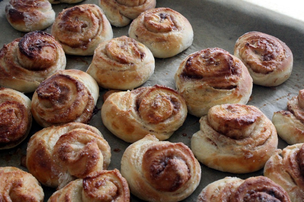 Leivoin myös pitkästä aikaa rahkapiirakkaa ja kierrepullia. Jussi ei tainnut uskoa, että ne riittävät seitsemälle hengelle pyhien ajan. Niinpä hän toi lisäksi kaupasta tarjousrahkapullapitkon. Pidin sitä pahana ja laitoin saman tien pakkaseen.