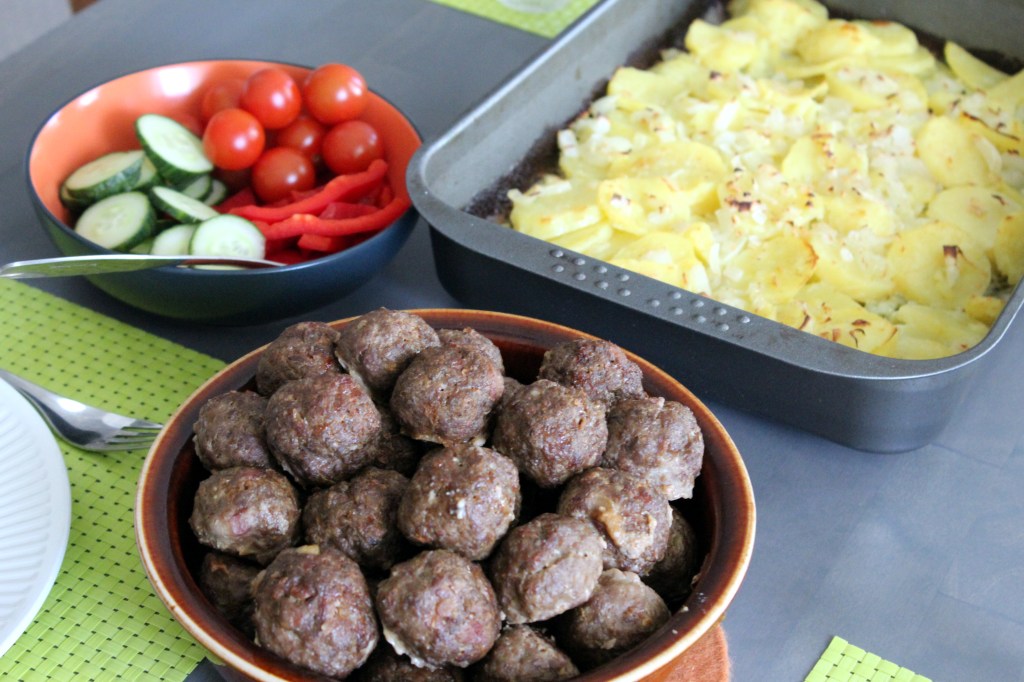Jussin Esko-veli ja Arja toivat tullessaan hirven jauhelihaa. Arja valmisti lihapullataikinan. Hän lisäsi hirven joukkoon pannulla kuumennettuja pekoninpaloja, suuren sipulin ja muutaman valkosipulinkynnen, pari ruokalusikallista korppujauhoja sekä kermaa. Niin ja tärkein lisä oli pussillinen ranskalaista sipulikeittoa. Lihapullat kysyivät uunipellillä ja niiden kaverina iso vuoka kermaperunoita.