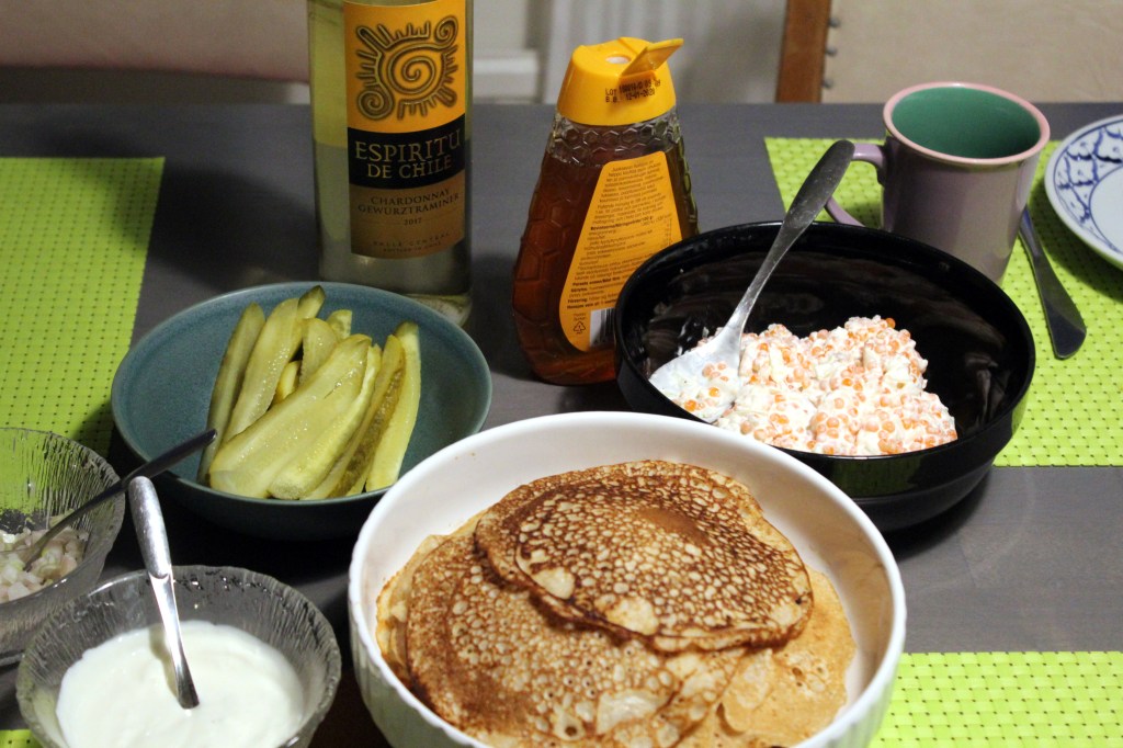 Juhlaruokien tekeminen on ilo. Suunnittelimme Jussin kanssa menun tarkkaan. Siihen kuului blinejä, lohi-mätimoussea, hirvipullia, kermaperunoita ja pisteenä iin päälle chilimaustettu thaicurry.