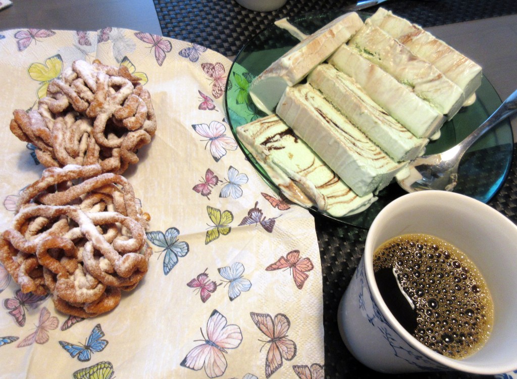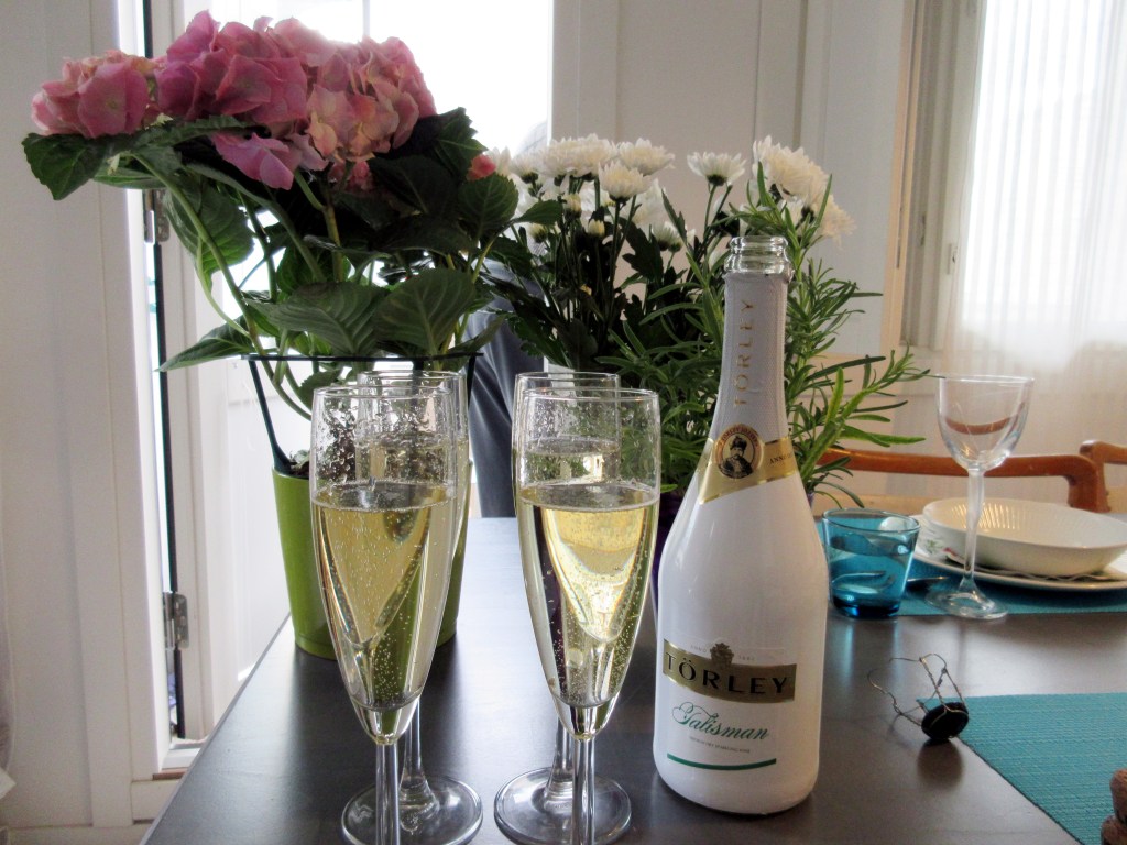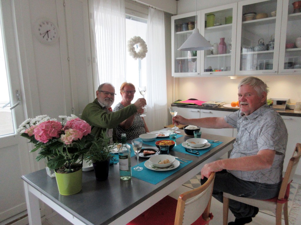 Terttu ja Immo tulivat iltapäivällä. Keittiössä tuoksui sitruunaruoho. Kilistimme vappumaljat parvekkeella. Ilmassa oli aavistus keväästä.
