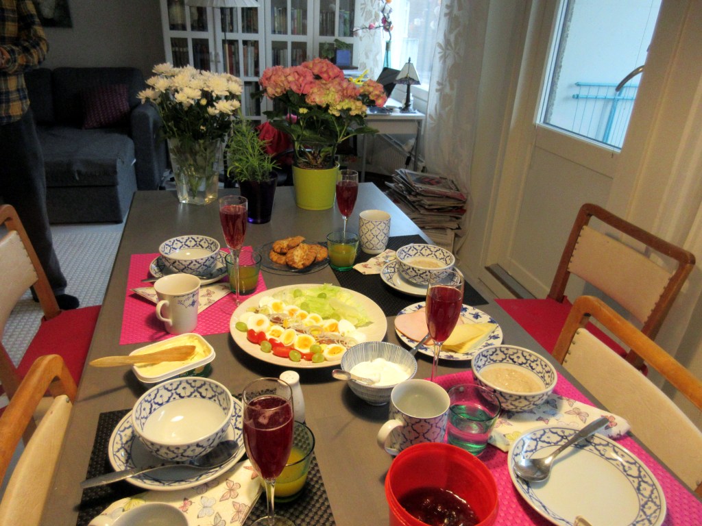 Heräsimme sateen lotinaan. Taivas oli harmaa ja sisällä pimeää. Katoin värikkään vappubrunssin. Se kirkasti ainakin ilmeet.