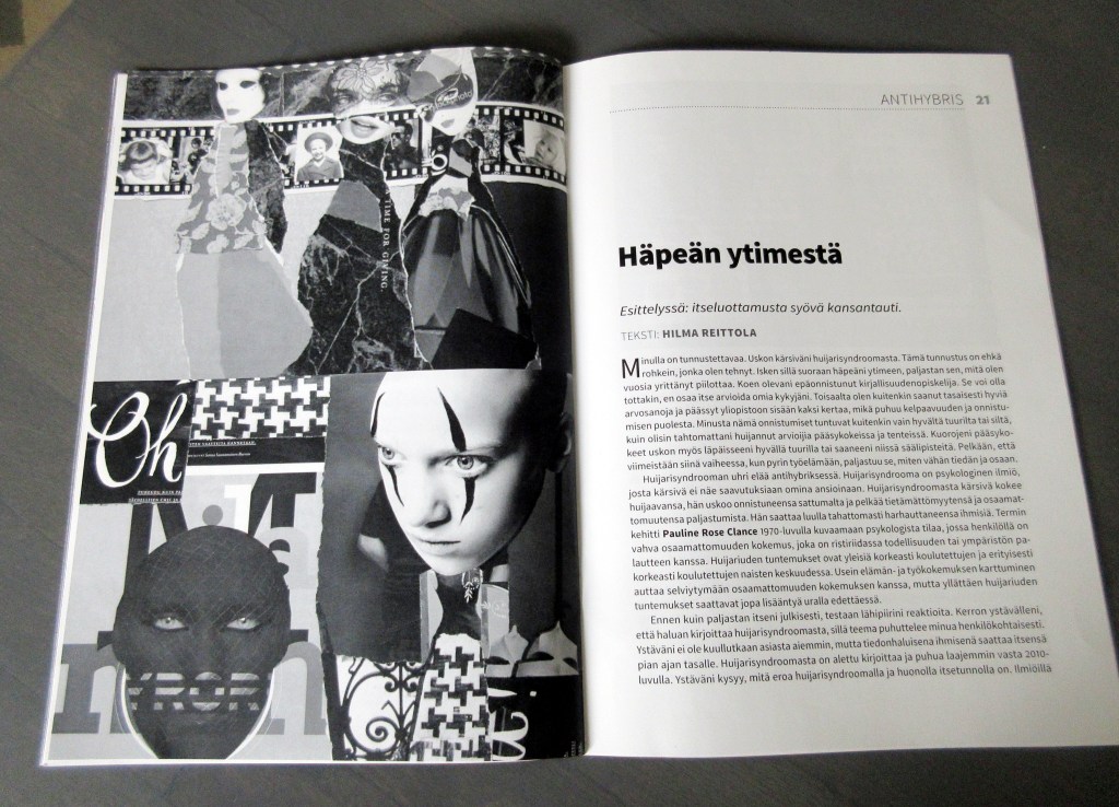 Graafikkoystävä Kukka kyseli joskus keväällä, saisiko hän ottaa kuvia kollaaseistani. Hänen sisarensa Maiju-Sofia Pitkänen tarvitsi kuvitusta Käkriäinen -lehteen. Sen teema oli Hybris. Lupasin oitis.
