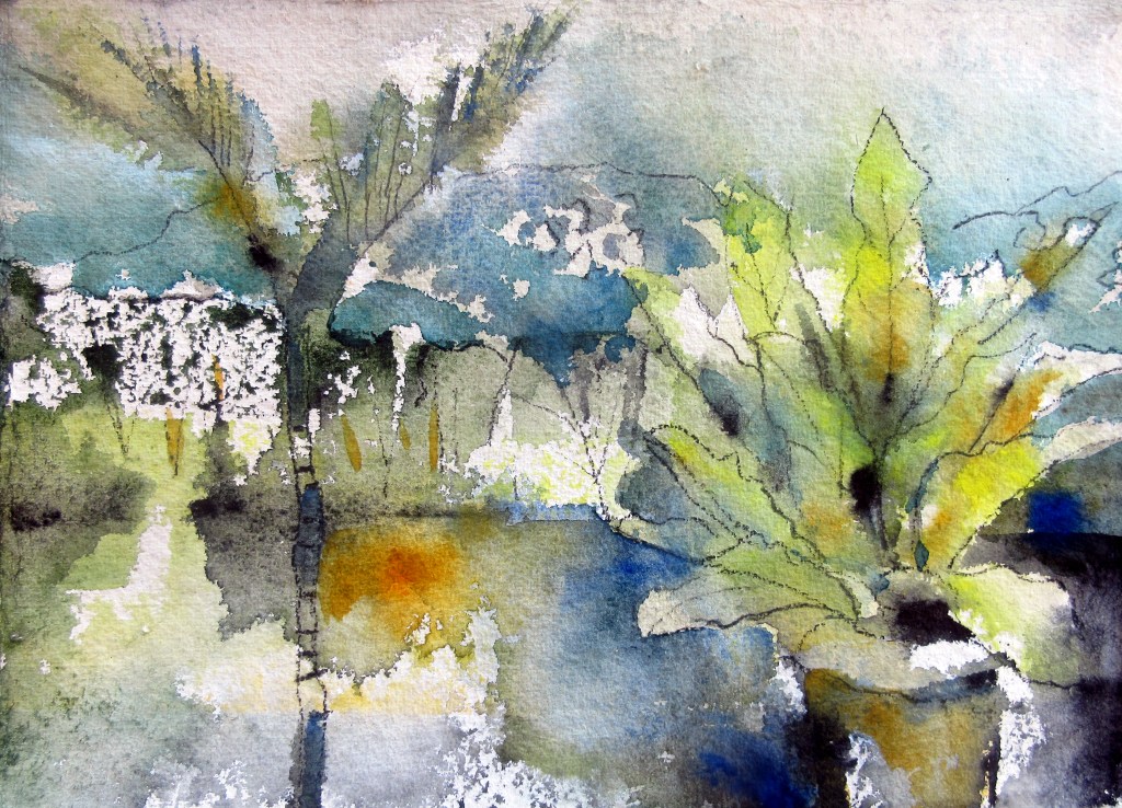 Vappupäivänä satoi. Tänään satoi. Tiedän, että sade tekee kevättä. Mutta harmaa ja märkä keli ei innosta ulkoiluun. Tosin minulla on taas tänään puuhapäivä. Meillä on Galleria Paperihuoneella näyttelyjen vaihto. Saan käyttööni grafiikanpajan seinät ja ikkunalaudan. Olen maalannut ahkerasti akvarelleja lomamatkoillamme. Nyt niistä parhaimmat pääsevät esille. Anna-tytär rientää avukseni leikkaamaan paspoja. Minä hoitelen kehystyksen ja ripustuksen. Jussikin lupasi tulla konsultiksi.
